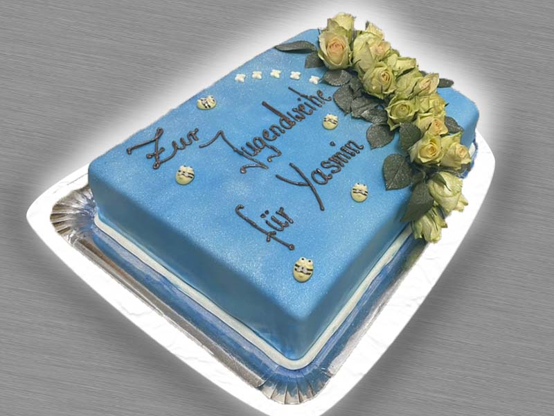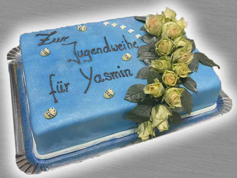 Torte zur Jugendweihefeier, mit blauen Zuckerguss,